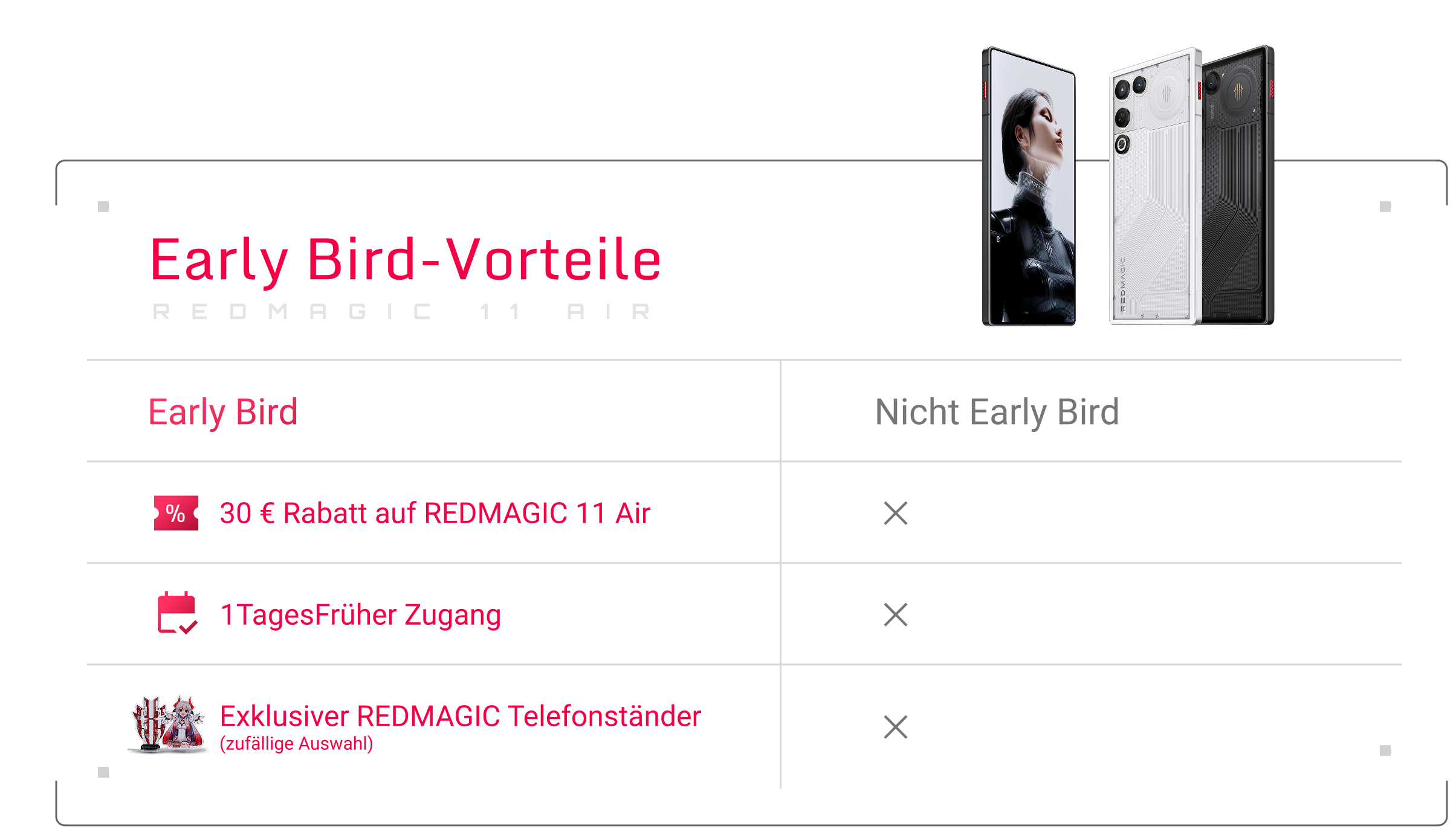 5) Die Version des Telefonständers wird zufällig ausgewählt. Jeder Early Bird-Gutschein enthält ein kostenloses Geschenk, das mit Ihrer REDMAGIC 11 Air-Bestellung versendet wird.