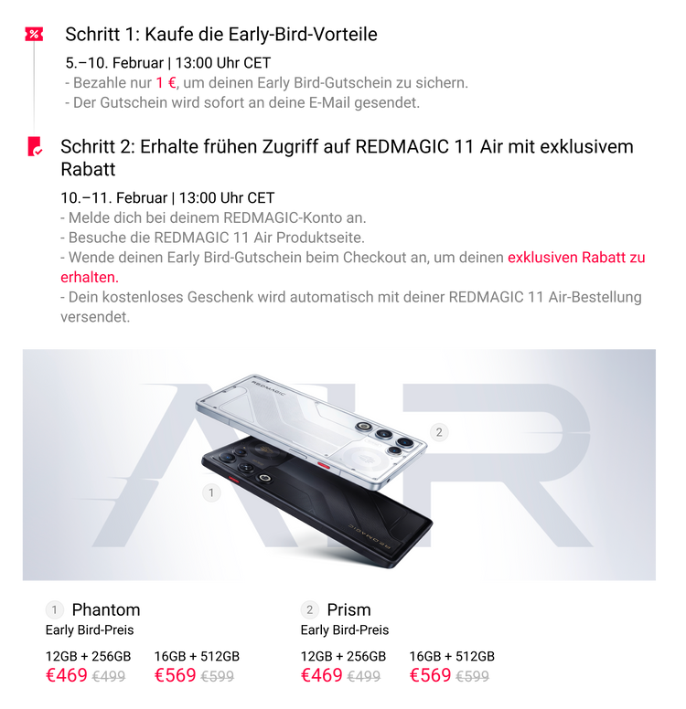 1) Vom 10. bis 11. Februar, 13:00 Uhr CET, können nur Early Bird-Nutzer das REDMAGIC 11 Air bestellen. Normale Nutzer können ab dem 11. Februar, 13:00 Uhr CET, bestellen.