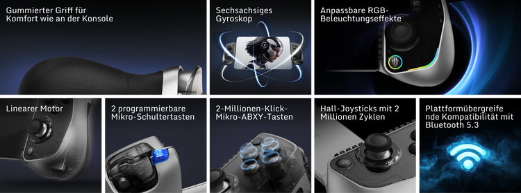 Mit der exklusiven Goper-App kannst du RGB-Beleuchtung, Vibration, Tasten-/Joystick-Belegung, Totzonen für Joysticks/Trigger, Makroaufnahmen und weitere Einstellungen personalisieren.
