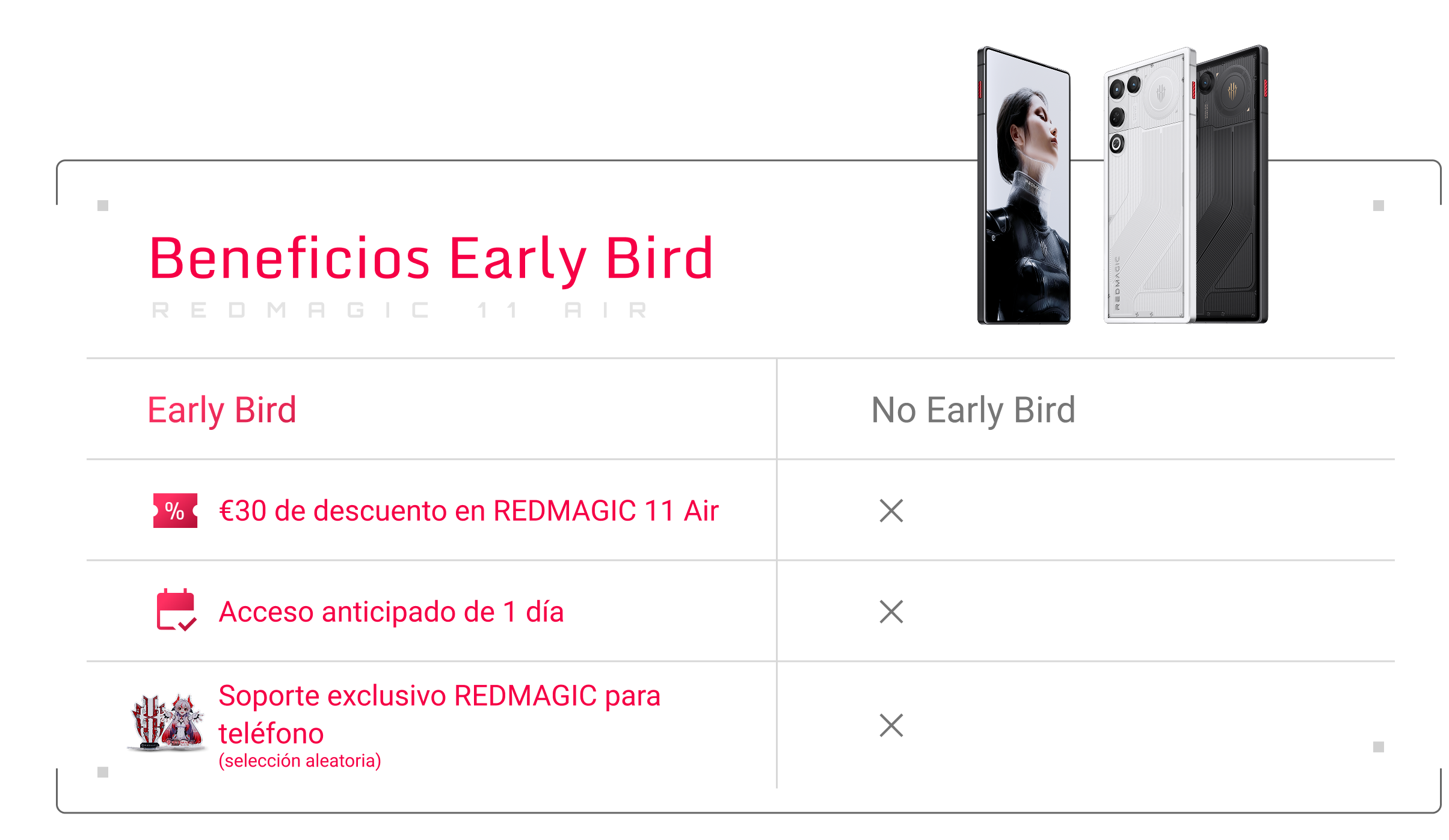 1) Del 10 al 11 de febrero, a las 13:00 CET, solo los usuarios Early Bird pueden solicitar el REDMAGIC 11 Air. Los usuarios regulares pueden realizar sus pedidos a partir del 11 de febrero a las 13:00 CET.