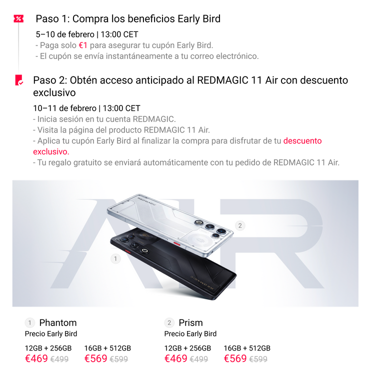 1) Del 10 al 11 de febrero, a las 13:00 CET, solo los usuarios Early Bird pueden solicitar el REDMAGIC 11 Air. Los usuarios regulares pueden realizar sus pedidos a partir del 11 de febrero a las 13:00 CET.