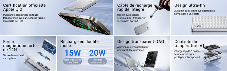 Avec seulement 14mm, cette batterie externe magnétique de 10 000mAh est 50% plus fine que les batteries traditionnelles et est équipée d’un câble de charge rapide avec sangle pratique pour une utilisation fluide.