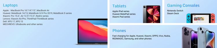 Enjoy fast-charging support for mainstream phones and laptops. Compatible with QC4.0/3.0, PD3.0/2.0, SCP, FCP, AFC, and Apple 2.4 protocols, while also being compatible with cross-brand charging, including Apple, REDMAGIC, and other ecosystems.