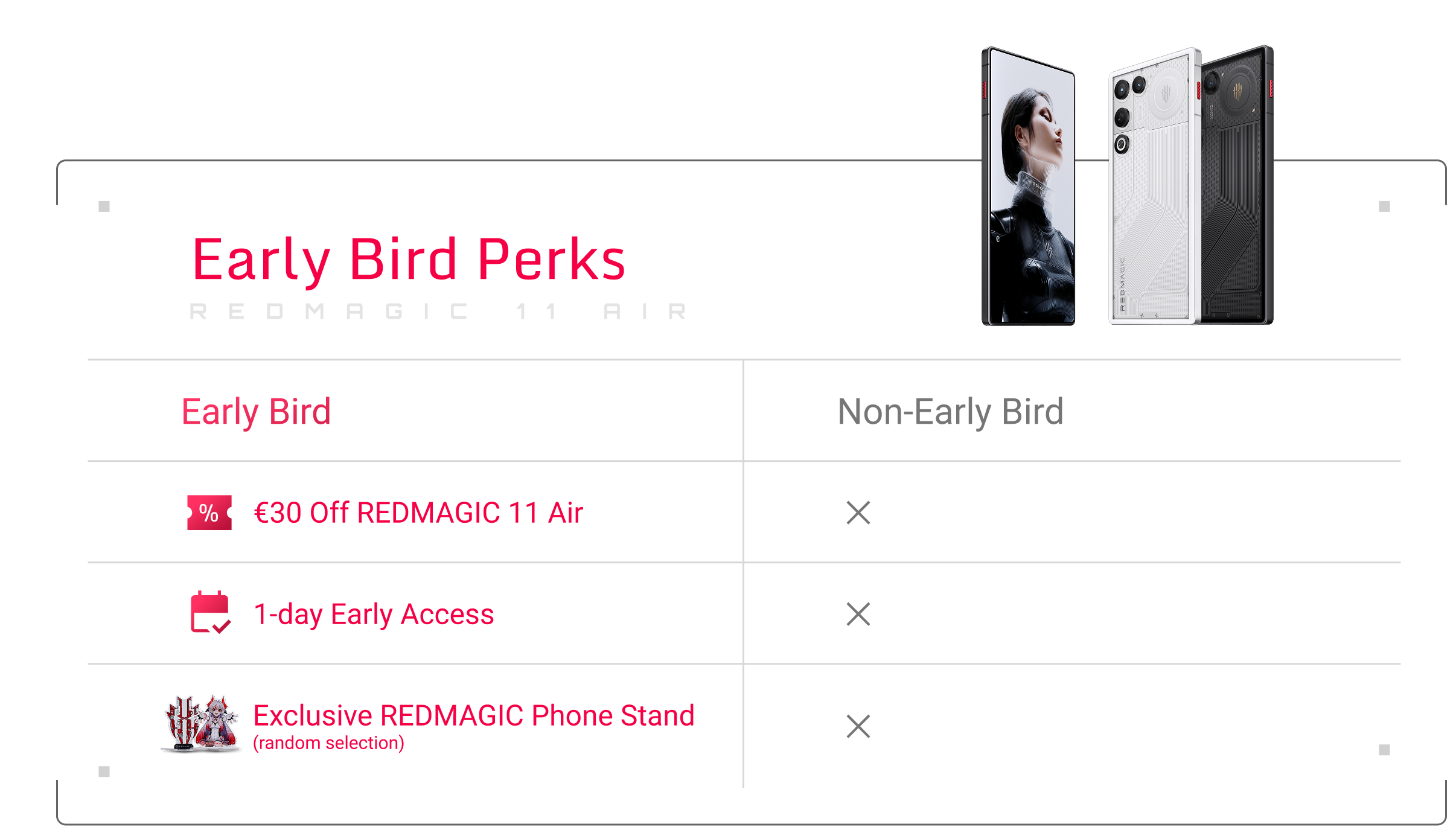 5) The phone stand version will be randomly selected. Each Early Bird Voucher includes one free gift, shipped with your REDMAGIC 11 Air order.