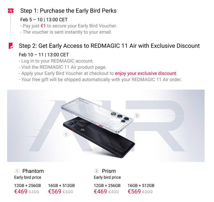 1) From Feb 10 to Feb 11, 13:00 CET, only Early Bird users can order the REDMAGIC 11 Air. Regular users can order starting Feb 11, 13:00 CET.