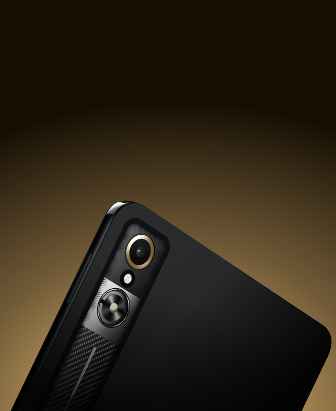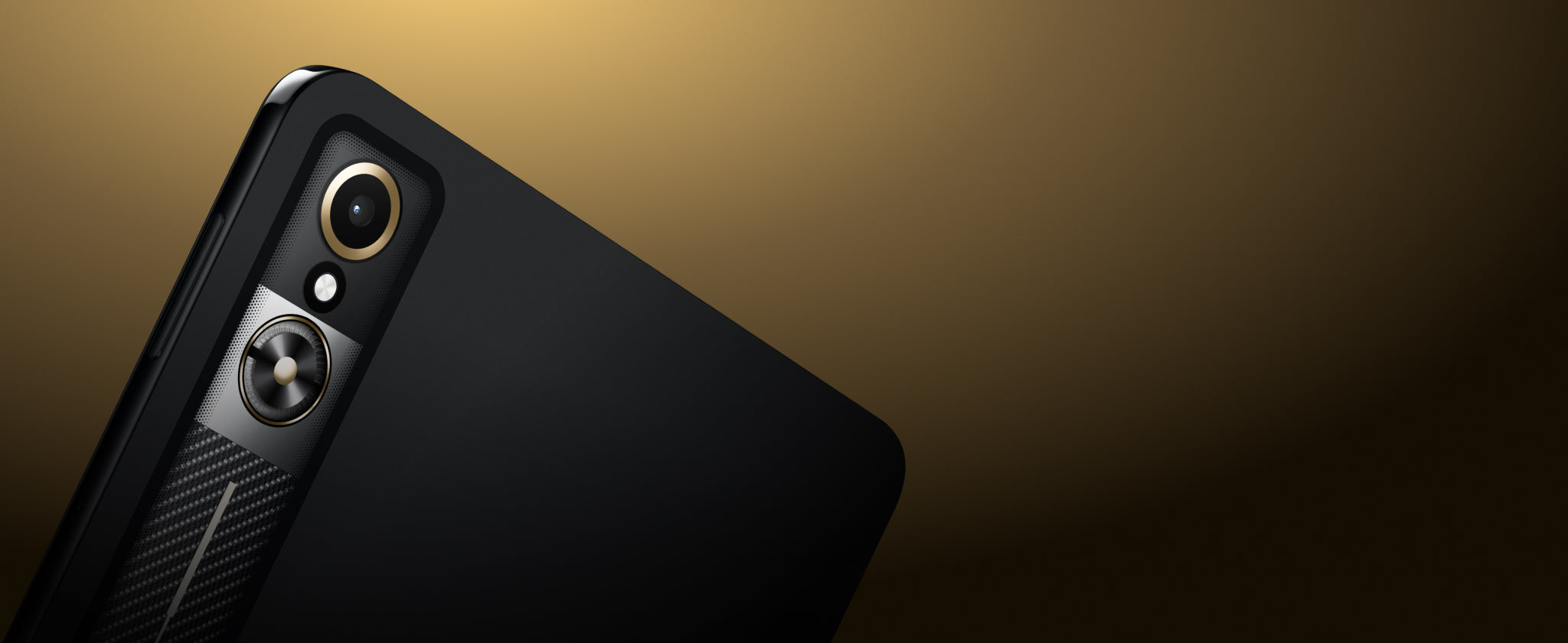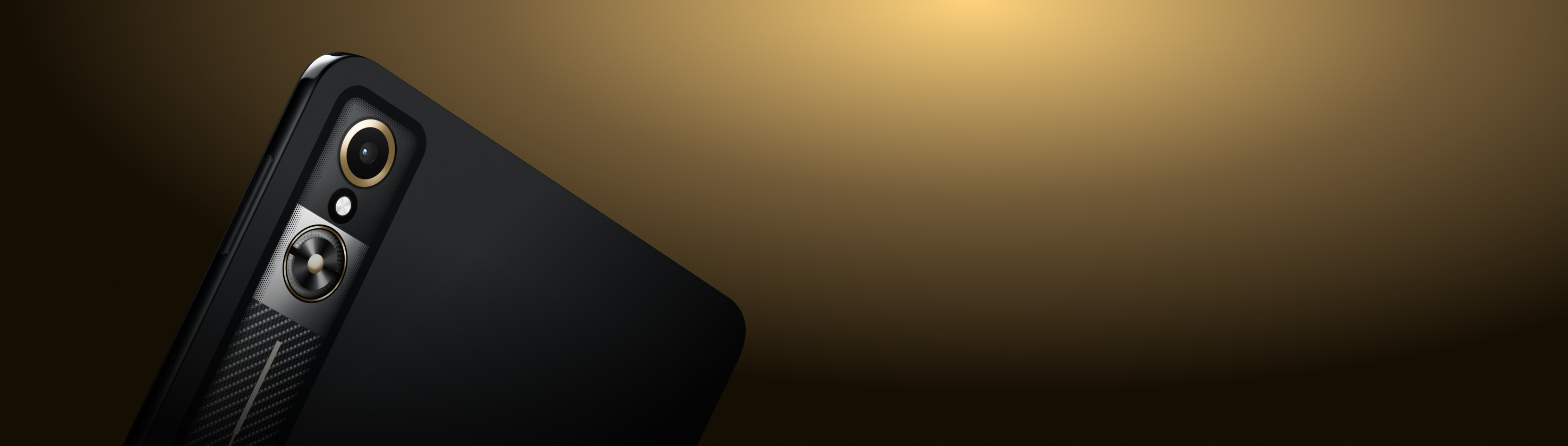 Premium gold-toned accent rings around the cooling fan and rear camera